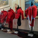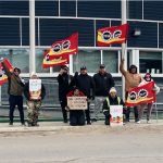Premier P.J. Akeeagok, centre in red, gathers with students for the raising of a Pride flag in front of the Nunavut legislative assembly in Iqaluit on Friday. The flag was raised to recognize June as Pride Month, which celebrates and commemorates lesbian, gay, bisexual and gender-diverse community pride. (Photo by David Lochead)