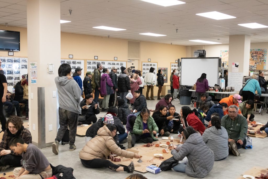 Caribou and char were on the menu Wednesday evening at a feast in support of community mental health at Inuksuk High School in Iqaluit. The school cafeteria was packed with a crowd ranging from toddlers to elders who gathered to enjoy a large serving of country food. Camilla Sehti, the GN’s territorial director of mental health and addictions, said the event was one of several scheduled throughout May to mark National Mental Health Week, which was officially May 1 to 7. (Photo by Jeff Pelletier)