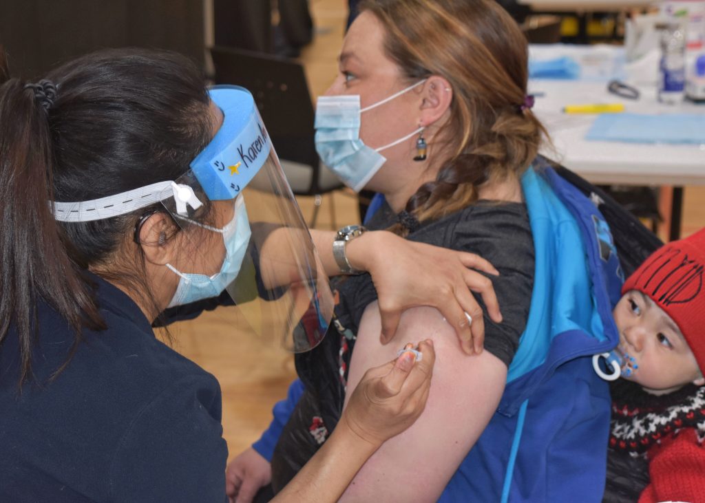Qullik Sequaluk of Kuujjuaq receives her second dose of the Moderna COVID-19 vaccine in late April while her 17-month baby boy, Lucassie, looks on. A third phase of vaccinations are scheduled to begin in Nunavik next week, when Pfizer doses will be made available for youth aged 12 to 17. (Photo by Niivi Snowball)