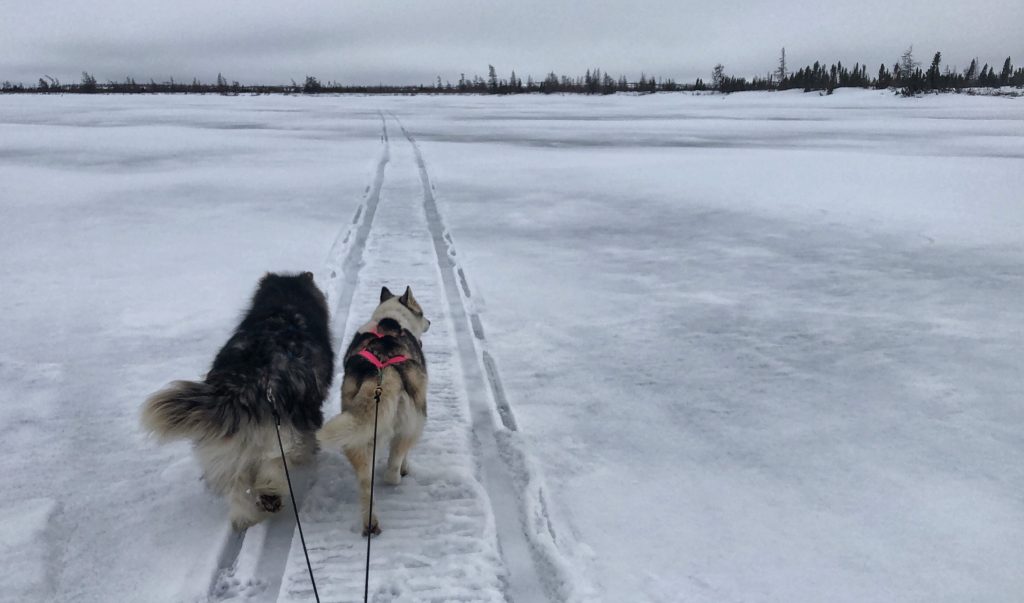 Isabelle Dubois took this photo Saturday afternoon while out on a kicksled ride with her two huskies on Tasirlaq Lake. “It was probably their last ride of the year, as the snow was getting wet and heavy, even on the lake, and getting scarce in some places on the land. Not to mention getting a bit warm for the dogs, especially for my big fur ball of a male (left),” she writes. (Photo by Isabelle Dubois)