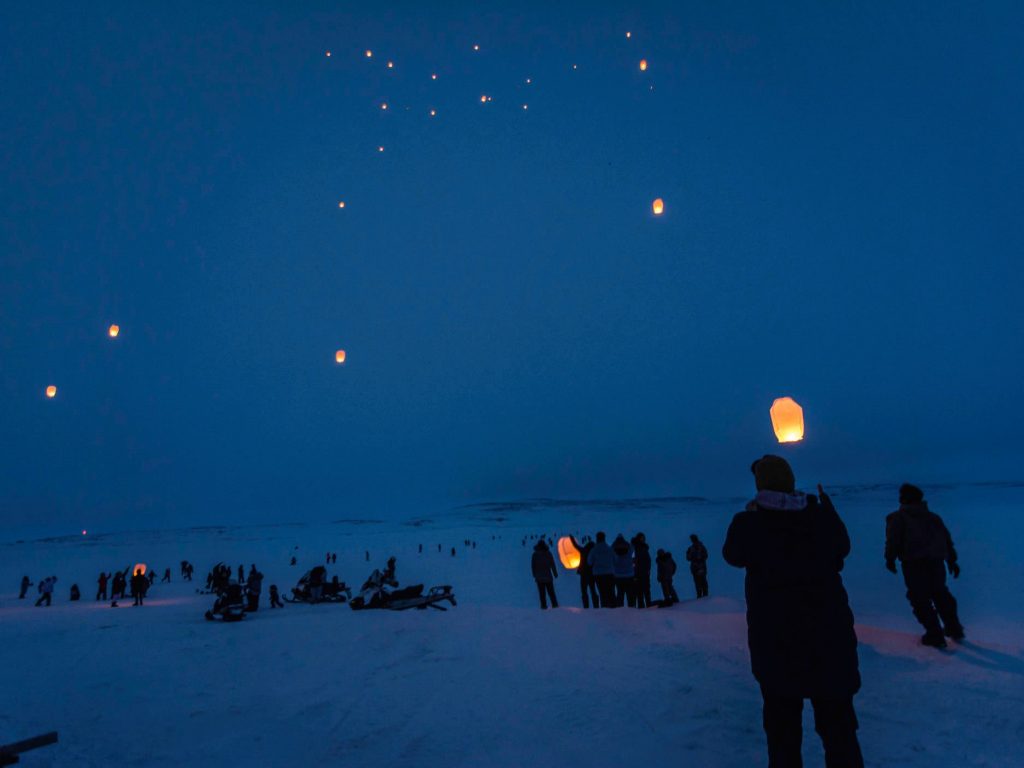 About 200 Inukjuak residents gathered to release sky lanterns on the evening of April 8 to remember loved ones that they had lost. (Photo by Sylvain Paradis)