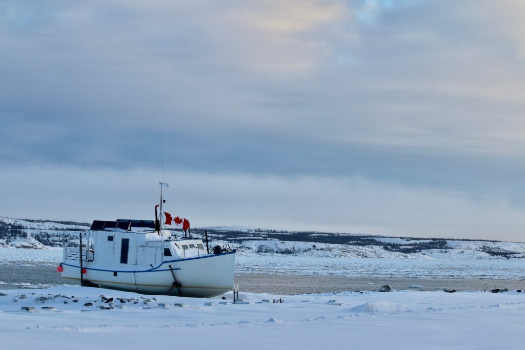 A boat sits on the banks of the Koksoak River near Kuujjuaq Jan. 18. “Super late into the season, and still, the Kuujjuaq River isn’t frozen,” writes Malaya Qaunirq Chapman. (Photo by Malaya Qaunirq Chapman)