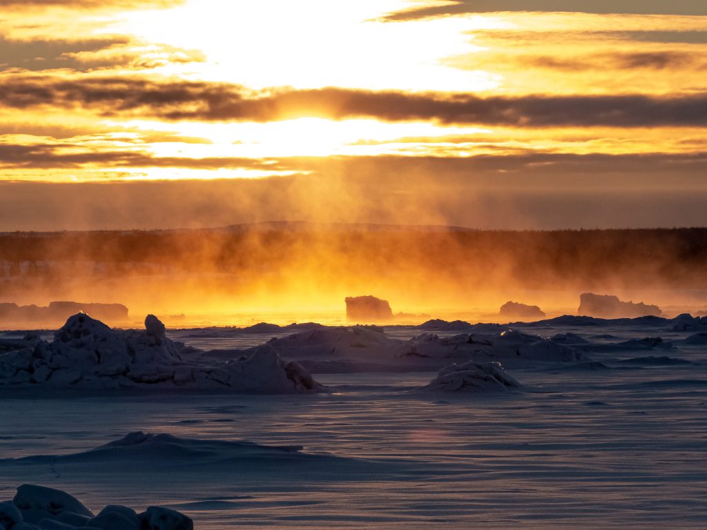Water vapour rises off the Koksoak River in Kuujjuaq at sunrise around 8 a.m. on Jan. 22. “The water, which has not yet frozen, and the smoke are reflected like a river of lava surrounding the icebergs,” writes photographer Maxence Chavanne. (Photo by Maxence Chavanne)