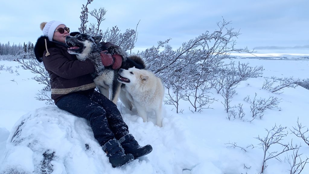Lavinia Flaherty of Kuujjuaq takes her two huskies, Chubby and Hunter, for a walk and snuggle Jan 26. (Photo by Malaya Qaunirq Chapman)