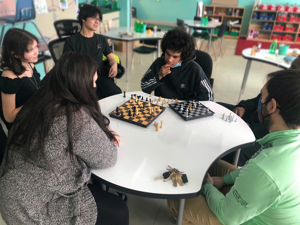 Matthew Hubloo, a Secondary 2 student at Jaanimmarik School here in Kuujjuaq, plays two chess matches simultaneously against the school’s vice-principal, Nicholas Ramsay, and Grade 4 English teacher, Sarah Nickerson, on Jan. 26. Hubloo won both games. (Students at the school are not required to wear masks in the classroom.) (Photo by Isabelle Dubois)