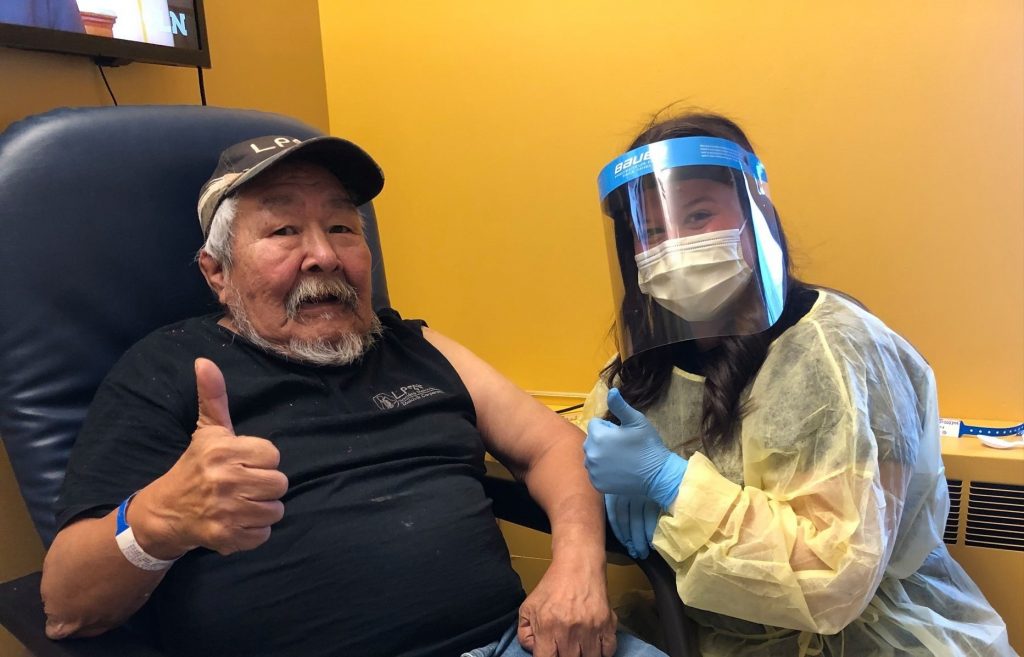 James Novalinga, 70, was the first resident of Puvirnituq to receive the COVID-19 vaccine Jan. 21, administered by nurse Vanessa Asfar at the Inuulitsivik health centre. Last week, Nunavik communities received a portion of the 1,000 shots of Moderna’s vaccine shipped to the region. As of Jan. 25, the Nunavik Regional Board of Health and Social Services says 568 people have been immunized. Roughly 85 per cent of those have gone to residents aged 55 and up, while the rest have been given to frontline workers and health-care staff. (Photo courtesy of NRBHSS)