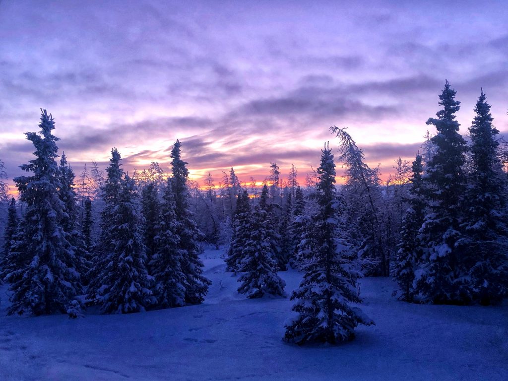 The sun sets on the frost-covered boreal forest outside Kuujjuaq on Jan. 28. (Photo by Isabelle Dubois)