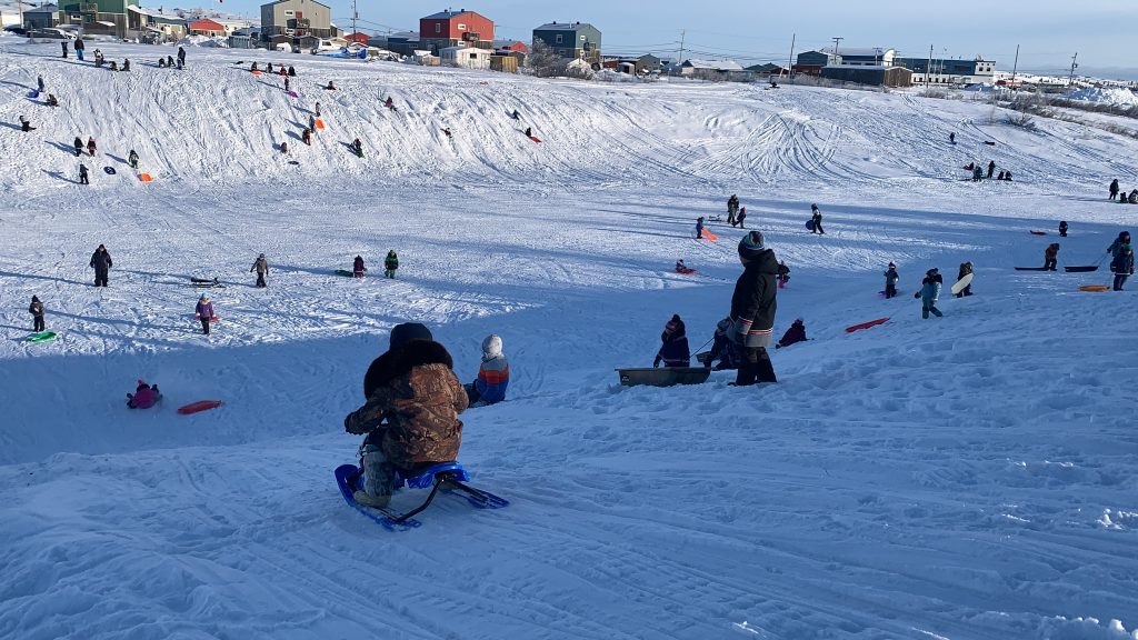 Kuujjuaq children flock to a popular sledding hill Jan. 29. (Photo by Malaya Qaunirq Chapman)