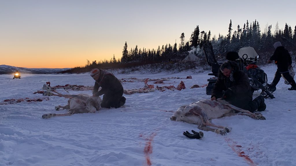 Daniel Gadbois, Etua Snowball and Tiivi Dupuis butcher caribou they’ve caught north of Kuujjuaq on Jan. 31 to provide meat for friends and family. (Photo by Malaya Qaunirq Chapman)