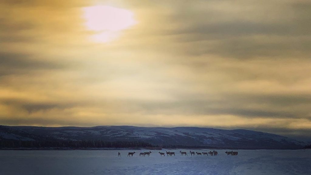 A caribou herd stands beneath the golden sky about 190 kilometres up river from Kuujjuaq Jan. 31. (Photo courtesy of Malaya Qaunirq Chapman)