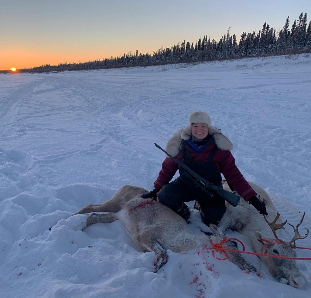 Malaya Qaunirq Chapman poses next to two caribou she caught, 190 kilometres up river from Kuujjuaq on Jan. 31. “I’m so happy to do as my ancestors did, hunt long distances and provide for my friends and family. I’m in my element here,” she writes. (Photo courtesy of Malaya Qaunirq Chapman)