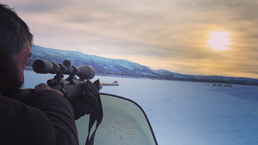 Etua Snowball takes aim at a caribou herd on Jan. 30, 190 kilometres up river from Kuujjuaq. (Photo by Malaya Qaunirq Chapman)