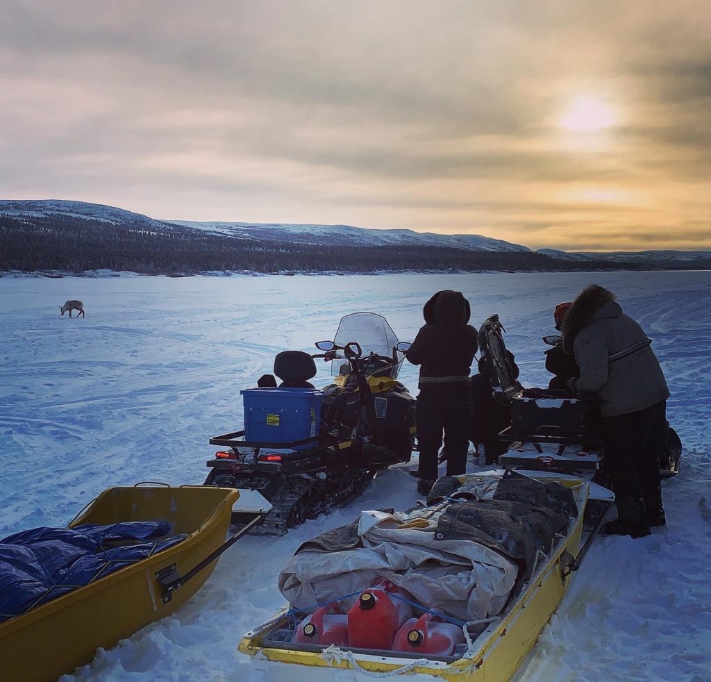 A lone caribou is spotted by Lavinia Flaherty, Tiivi Dupuis and Daniel Gadbois, who take aim 190 kilometres up river from Kuujjuaq, on Jan. 30. (Photo courtesy of Malaya Qaunirq Chapman)