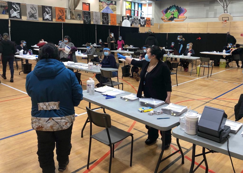 Health-care workers welcome Kuujjuaq residents to the community’s first general vaccination clinic in February. Regional health authorities are now rolling out a second round of immunization clinics. (Photo by Isabelle Dubois)