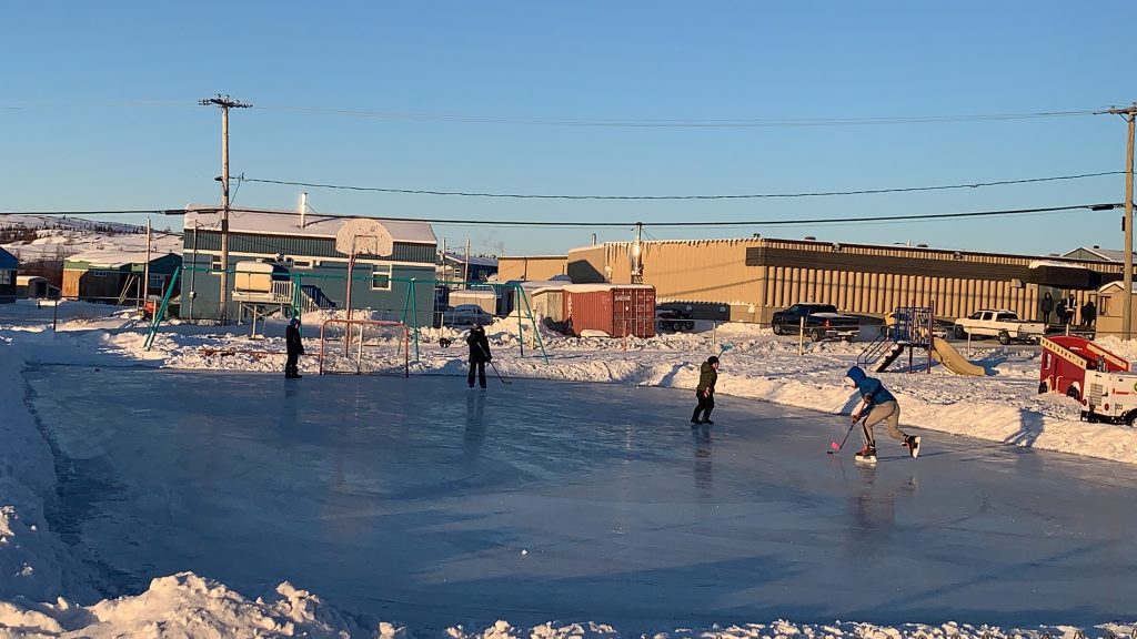Children in Kuujjuaq play hockey at an outdoor rink in the middle of town on Dec. 9. (Photo by Malaya Qaunirq Chapman)