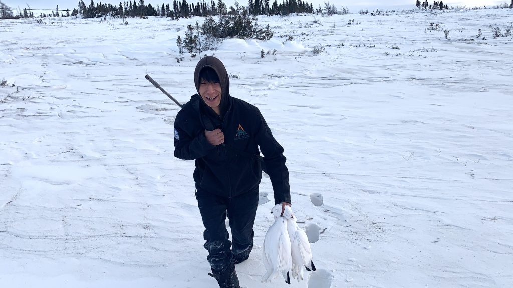 Oolai Qaunirq retreives ptarmigan, or aqiggiq, he caught along Kuujjuaq’s Ippialuk Road on Sunday morning, Dec. 13. (Photo by Malaya Qaunirq Chapman)
