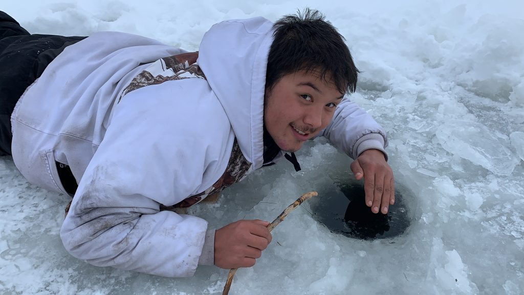 Saimmajualy Ekomiak fishes through a hole in the ice he made at False River, outside of Kuujjuaq, during the weekend of Dec. 5. (Photo by Malaya Qaunirq Chapman)