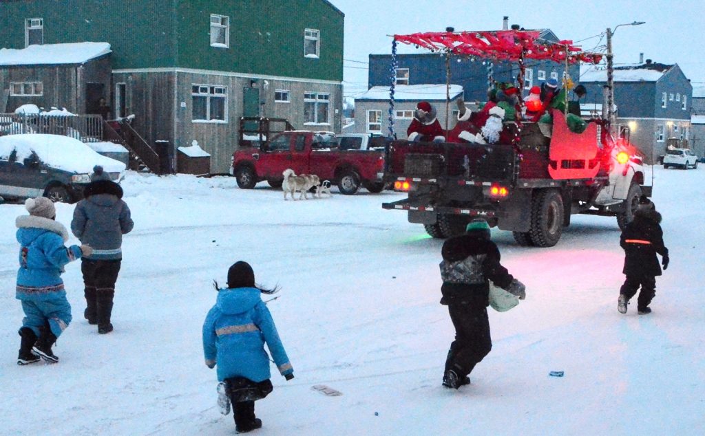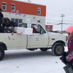 Santa Claus and his helpers distribute candies and other presents — such as hats, gloves and mitts — during a tour around Kuujjuaq on a municipal flat bed truck dubbed Rudolph on Sunday, Dec. 20. (Photo by Isabelle Dubois)