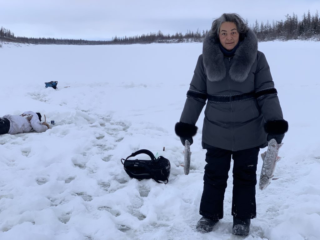 Selena Whiteley holds two fish she pulled out from her fishing hole at False River, outside of Kuujjuaq, during the weekend of Dec. 5. (Photo by Malaya Qaunirq Chapman)