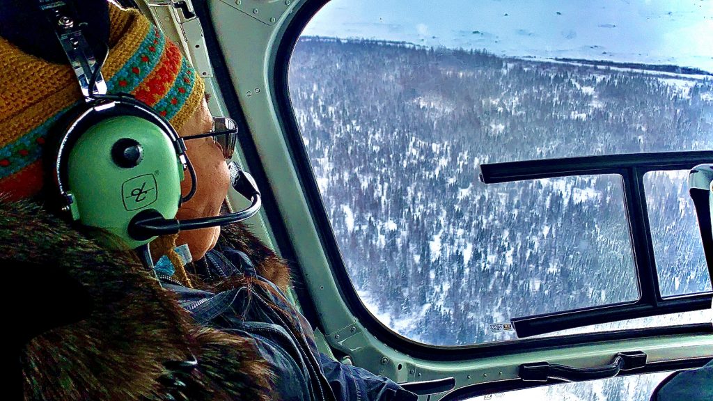 Victoria Grey looks out the window of a helicopter while anticipating her arrival at her fishing cabin at False River, outside of Kuujjuaq, during the weekend of Dec. 5. (Photo by Malaya Qaunirq Chapman)