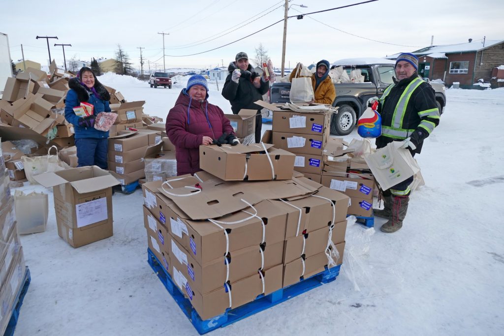 Volunteers help pack up food baskets in Kuujjuaq on Thursday, Dec. 17. Over the last decade, community organizations like Nayumivik Landing Corp., Makivik Corp. Kuujjuamiut Inc. and the Northern Village of Kuujjuaq contribute to the hampers, which were delivered to just over 700 homes in the Nunavik community this week. (Photo by Allen Gordon)