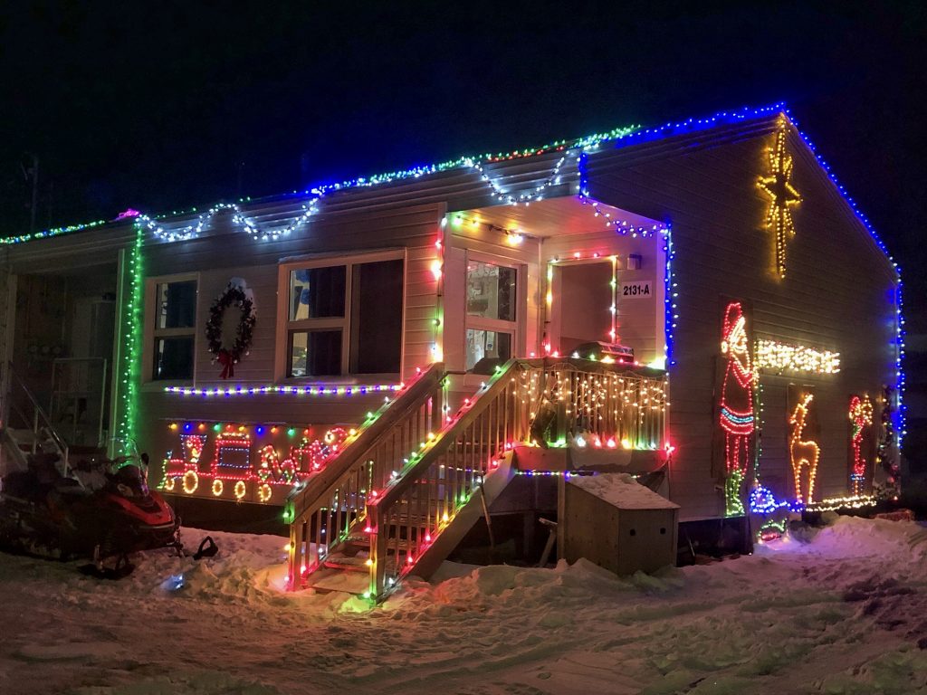 Jeannie Pootoo Gordon’s colourfully decorated home took top honours in Kuujjuaq’s holiday lights competition this year, held Dec. 24. Gordon won $2,500 for her efforts. (Photo by Isabelle Dubois)
