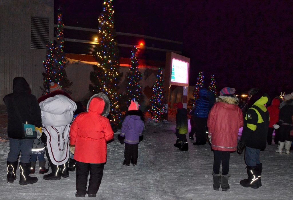 Kuujjuaq residents gather in front of the northern village office for the lighting of Christmas trees on Dec. 21. (Photo by Isabelle Dubois)