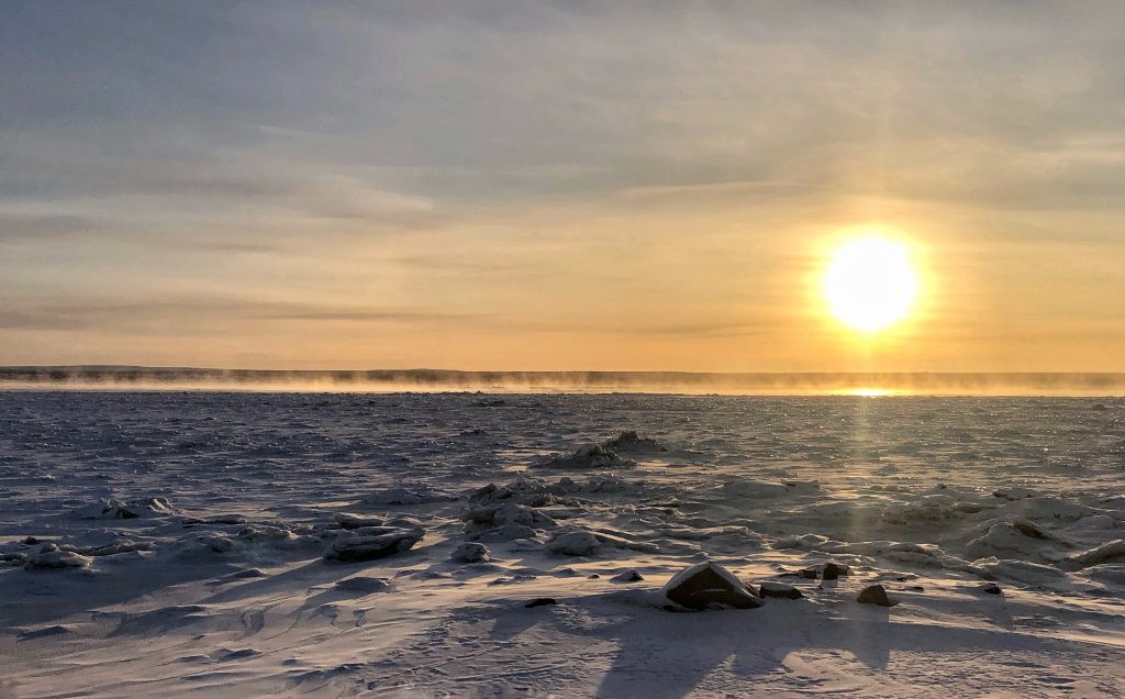 Water vapour rises off the freezing Koksoak River near Kuujjuaq on the morning of Dec. 17. (Photo by Isabelle Dubois)