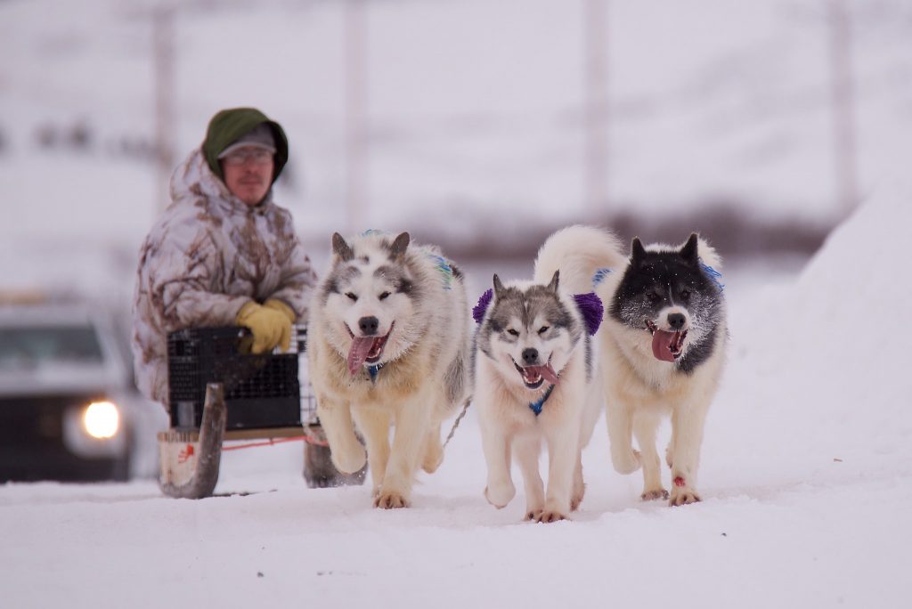 Jason Annanack steers his dog team through the streets of Kangiqsualujjuaq Dec. 24, as part of that community’s annual Christmas races. (Photo by Felix St-Aubin)
