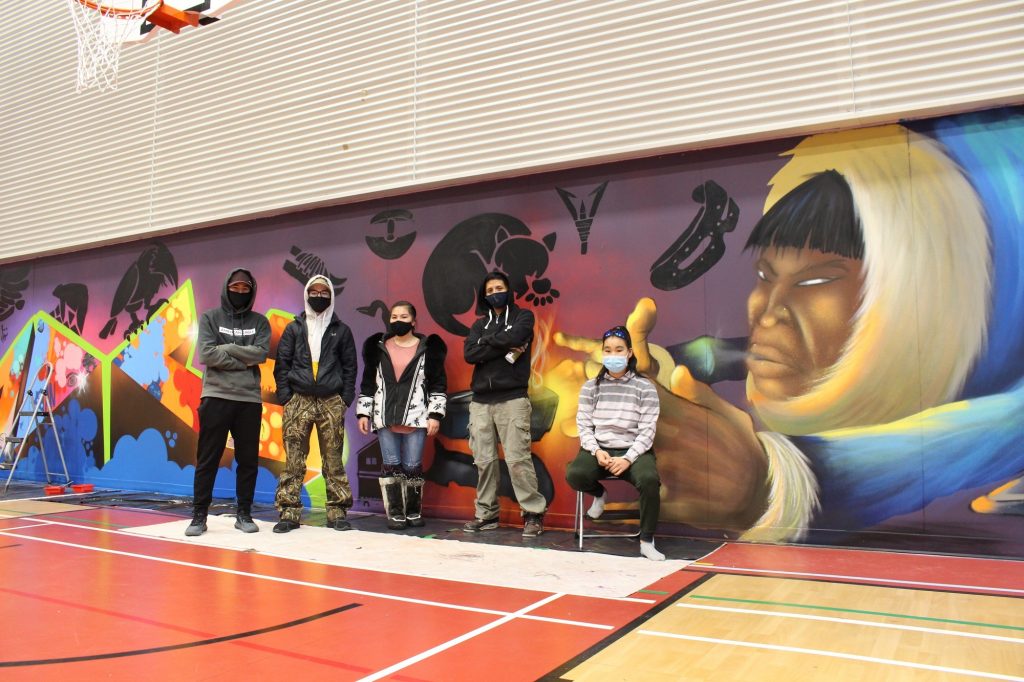 Students from Tarsakallak school in Aupaluk pose in front of a new mural they recently helped create in the Nunavik school’s gymnasium. Aupaluk won a region-wide fire prevention contest put on by the Kativik Municipal Housing Bureau’s Pivallianiq program earlier this year. Their winning prize was a mural event run by a professional muralist, in which students painted imagery from the Inuit legend Kautjajuk. (Photo courtesy of Pivallianiq)