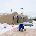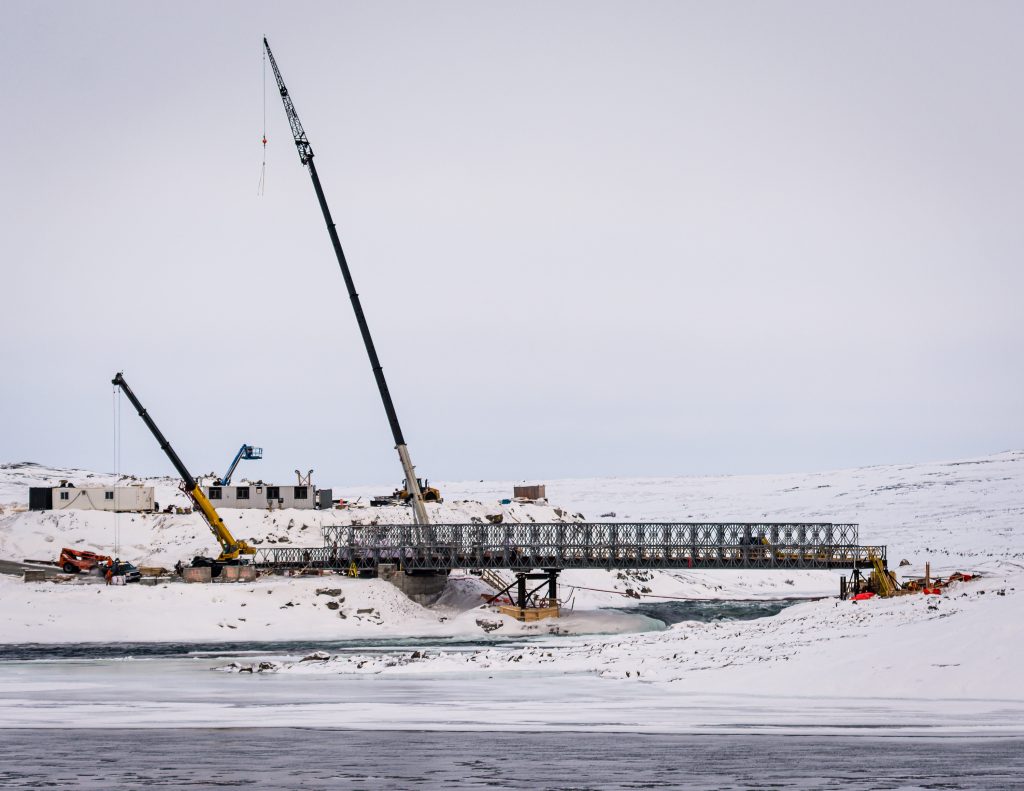 A new bridge was installed across the river near Inukjuak on Dec. 5, as part of work on 7.5-megawatt run-of-the-river hydro project that’s expected to be complete by late 2022. The bridge will connect to an access road on the far side of the river. The power project is expected to provide nearly all the electricity required for the nearby community of 1,800, which currently relies on diesel. (Photo by Sylvain Paradis)