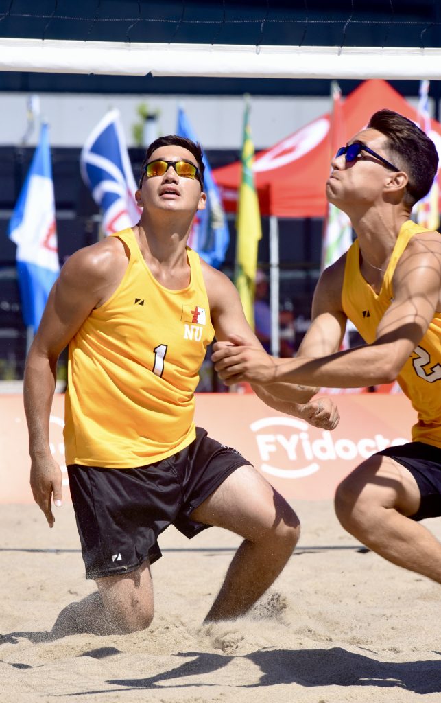 In men’s beach volleyball action Thursday at the Canada Summer Games, Nunavut’s men’s team members Ian McDonald, left, and Aiden Anawak, watch for the ball in a consolation-round game against Yukon. Nunavut lost 21-17 and 22-20. In women’s beach volleyball, Nunavut’s team of Talia Grant and Shawna Kyak lost to Prince Edward Island by scores of 21-11 and 21-13. (Photo by Denis Cahill, special to Nunatsiaq News)