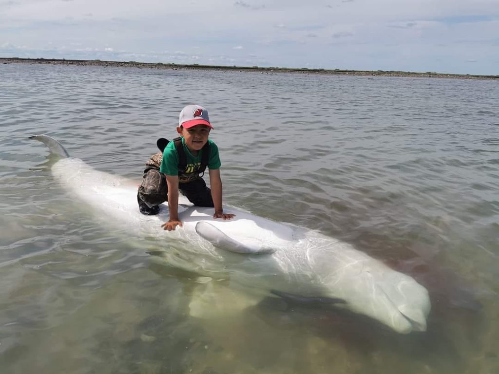 Seven-year-old Brody Panigoniak shows off the beluga he harpooned south of Arviat on July 23. According to his mother, Hilda, it was the boy’s first-ever beluga and he shared the muktuk with the community. (Photo courtesy of Hilda Panigoniak)