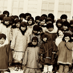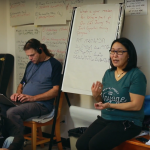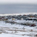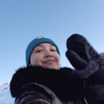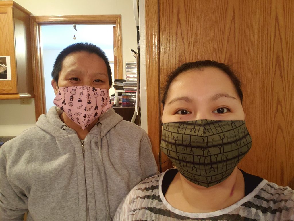 From left: Viola Haqpi and Holly Kayuryuk with the Abluqta Society in Baker Lake try on face masks that sport patterns from Inuit culture on Dec. 7. A box of 200 of the masks, made by Tanya Innaarulik, were donated by Transformative Life Skills Nunavik. The Abluqta Society plans to give them away in January, once the current supply of masks in the community becomes less available. (Image courtesy of the Abluqta Society)