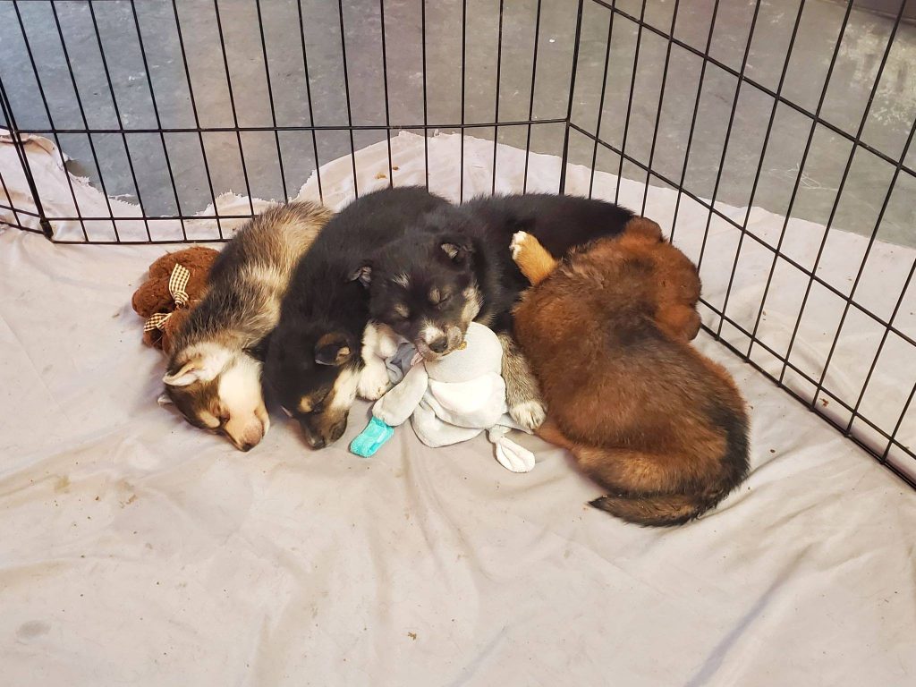 Puppies huddle together in an enclosure at the Iqaluit Humane Society’s shelter, which is set to be demolished in 2021. The IHS received a $250,000 donation towards the construction of a new facility. (Photo courtesy of IHS)