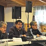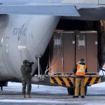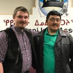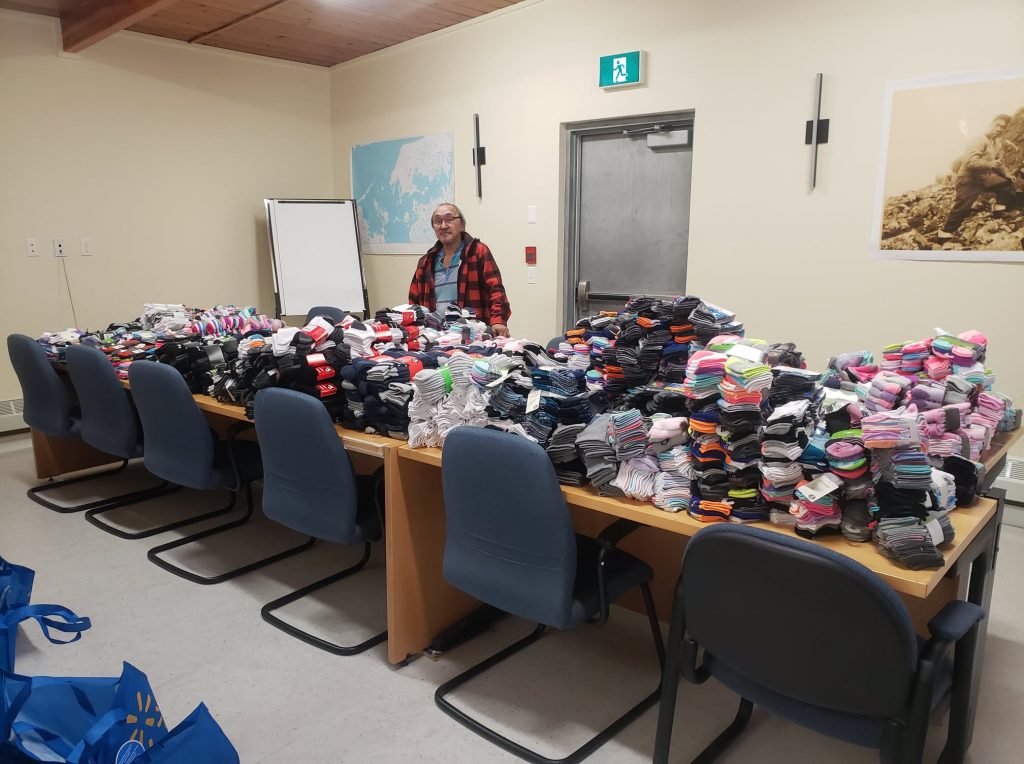 Ikey Evalik, TMAC Resources Inc.’s Inuit impact benefit agreement coordinator, helps prepare 1,500 pairs of socks to be distributed to Kitikmeot students through the region’s elementary schools ahead of Christmas. He’s seen here on Dec. 1 at TMAC’s office in Cambridge Bay. The company says that, with its Nunavut operations slowed by the COVID-19 pandemic, the socks were purchased with funds usually dedicated to site Christmas activities. (Photo courtesy of TMAC)