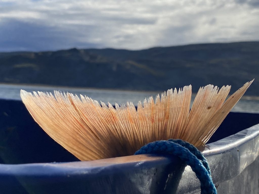 Elisapee Nowdluk of Iqaluit took this photo of the fin of an Arctic char after net fishing at Nungarut, or Bay of Two Rivers, across Frobisher Bay, on Sunday, Aug. 23. “It was a beautiful day,” she said. (Photo by Elisapee Nowdluk)