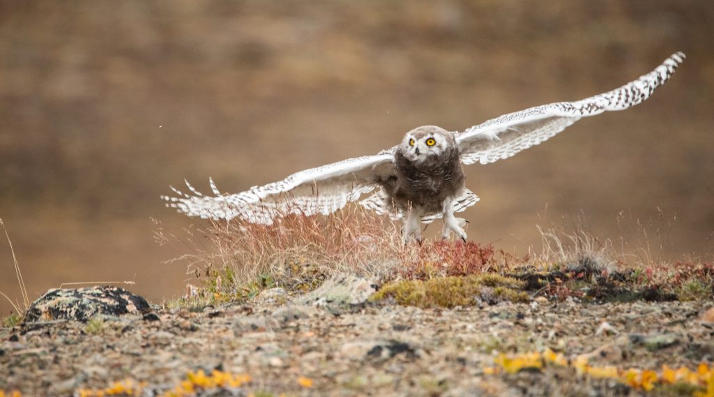 A fledgling snowy owl practises its flying skills on the hills above Marcil Lake, just northwest of Arctic Bay, on Sunday, Aug. 23. “I’ve seen the adults hunting in the general area for some time now, but the juveniles must have fledged around this weekend as they’ve been visible since at least Friday,” writes photographer Clare Kines. “The young owls will be practising their flying and perhaps their hunting skills as well, although the adults are likely still feeding them most of their food. They’ll move off later in the fall as winter sets in.” (Photo by Clare Kines)