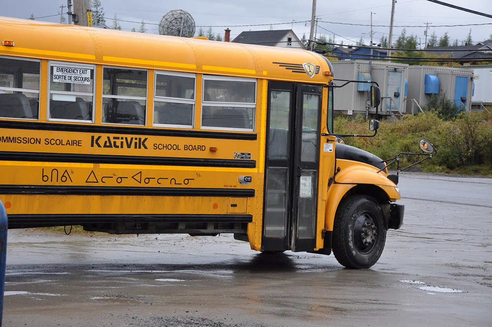 A Kativik Ilisarniliriniq school board bus drives through Kuujjuaq. Students across Nunavik are returning to school this week. (File photo by Sarah Rogers)