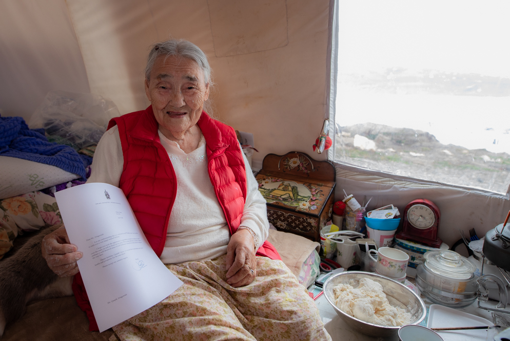 Qapik Attagutsiak holds a letter from Prime Minister Justin Trudeau on June 27, sending her birthday greetings and wishing her well for the year ahead. Arctic Bay resident and regular Nunatsiaq News contributor Clare Kines delivered the letter to Attagutsiak, who was making bannock when he arrived. (Photo by C. Kines)