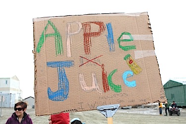 Rebecca Hainnu held a sign her daughter made, it said, “apple juice, $3.89, I wish I could have some.”