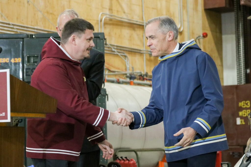 Then-premier P.J. Akeeagok, left, shakes hands with Prime Minister Mark Carney in Iqaluit in March 2025. Carney is wearing an atigi made by Iqaluit seamstress Emily Joanasie. (Photo by Jeff Pelletier)