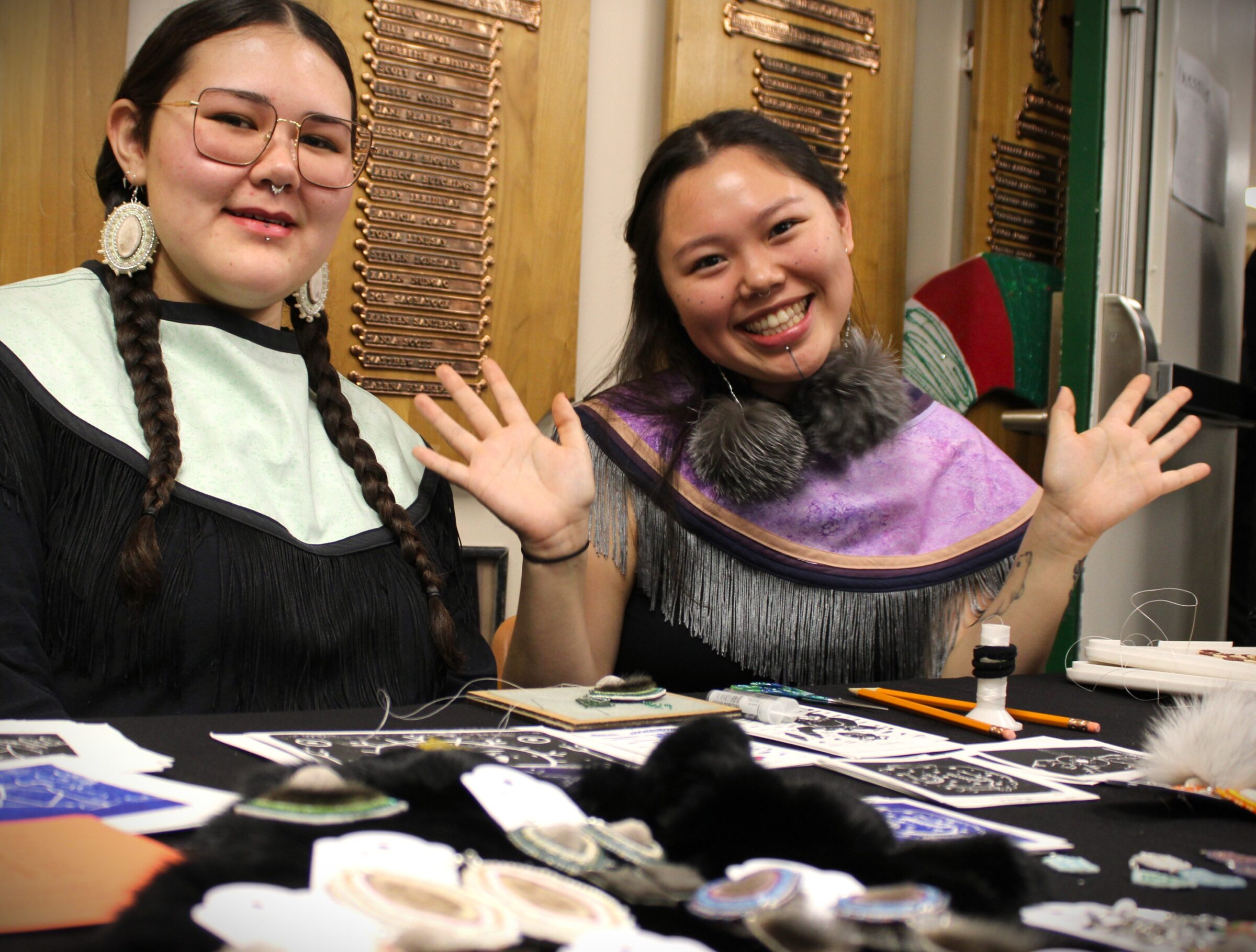 Natalya Boos of Natsbeading, left, and Rosalie DeMaio of Rosalie Beads share their wares Saturday morning during the Inuksuk High School craft sale in Iqaluit. The pair’s work includes a wide variety of beading, some using natural materials such as fur, fish skin, and shells. (Photo by Daron Letts)