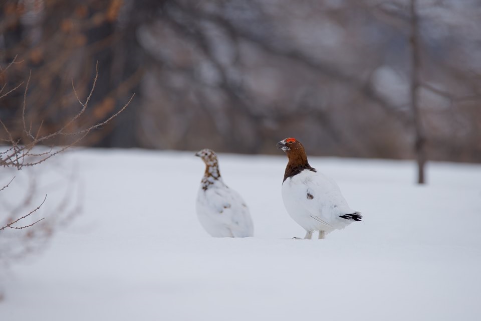 It’s springtime in Nunavik and the willow ptarmigan are out looking for food and courtship, like this pair spotted outside of Kangiqsualujjuaq. The birds stay white through the winter months to remain camouflaged in the snow, but the head of the male willow ptarmigan changes to red and brown in the spring. (Photo by Felix St-Aubin)