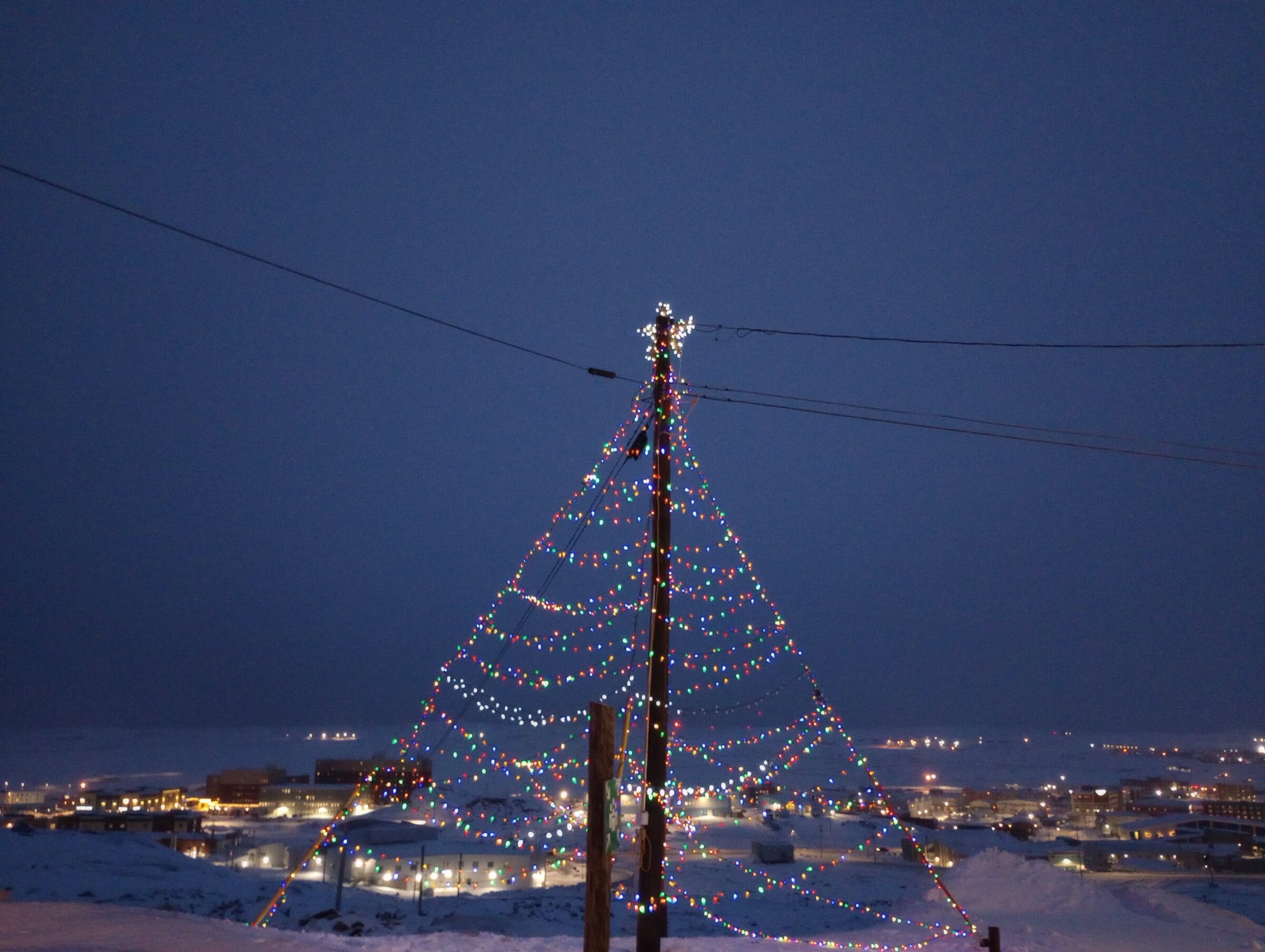 A Christmas tree erected by Qulliq Energy Corp. lights up the sky on power plant hill overlooking Iqaluit. (Photo by Livete Ataguyuk)