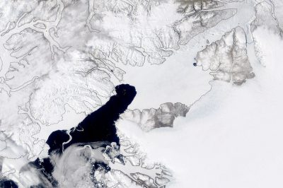 A NASA Earth Observatory image taken on May 22, 2020 shows an ice bridge in the Nares Strait and the area of open water known as Pikialasorsuaq. (NASA)