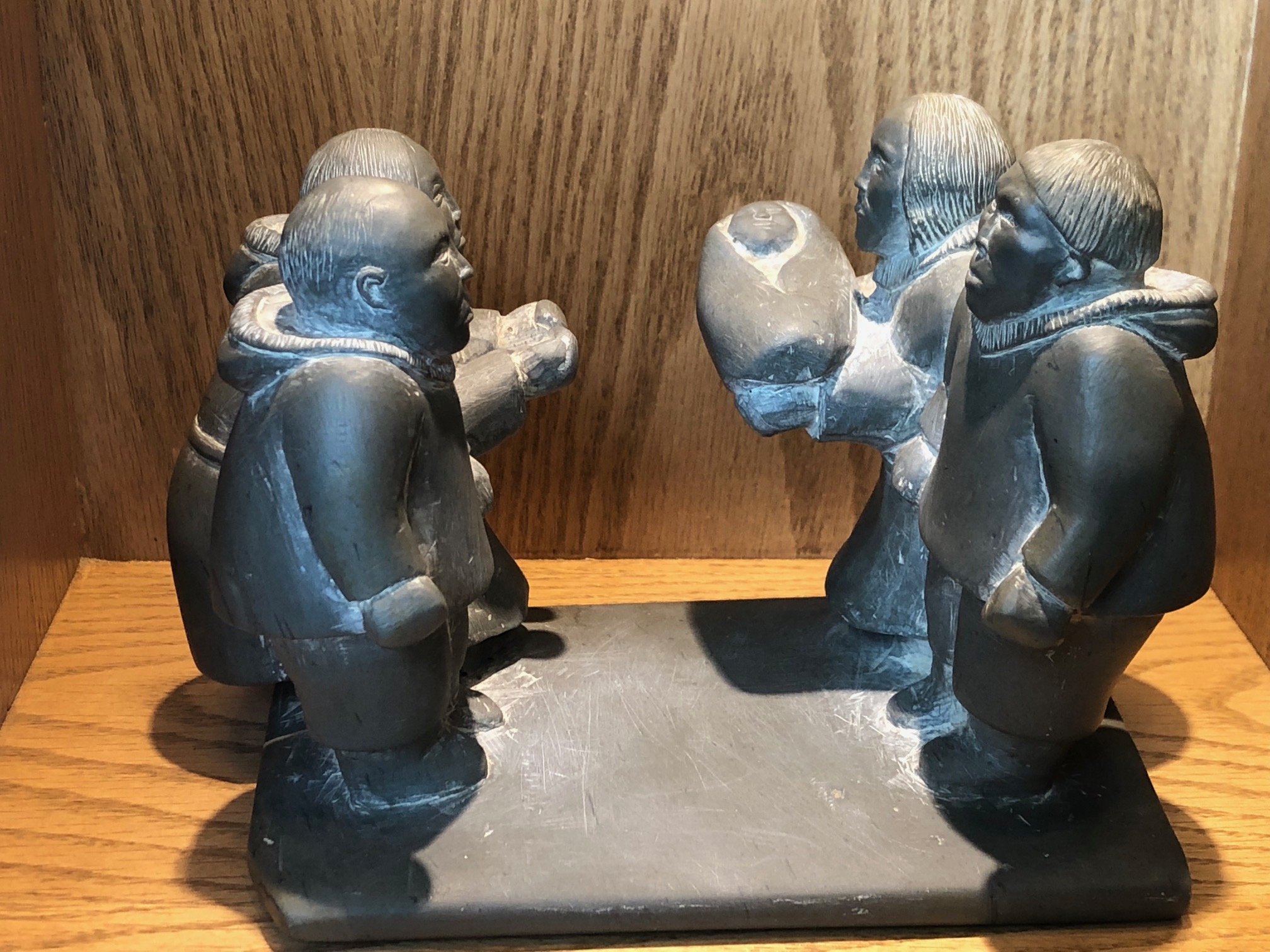 This carving from the late 1960s shows a traditional adoption, validated in 1969 by Justice J.H. Sissons of the Northwest Territories. It’s among the carvings from the Sissons-Morrow collection of Inuit carvings from the N.W.T., currently on display at the Nunavut Court of Justice in Iqaluit. That collection began in 1956 when Kaotak, a man found not guilty of killing his father, presented Sissons with a carving depicting the trial. After that, Sissons would commission local carvers to depict cases in stone, ivory, caribou antler, soapstone and metal. Later, Justice William J. Morrow continued the collection. (Photo by Jane George)