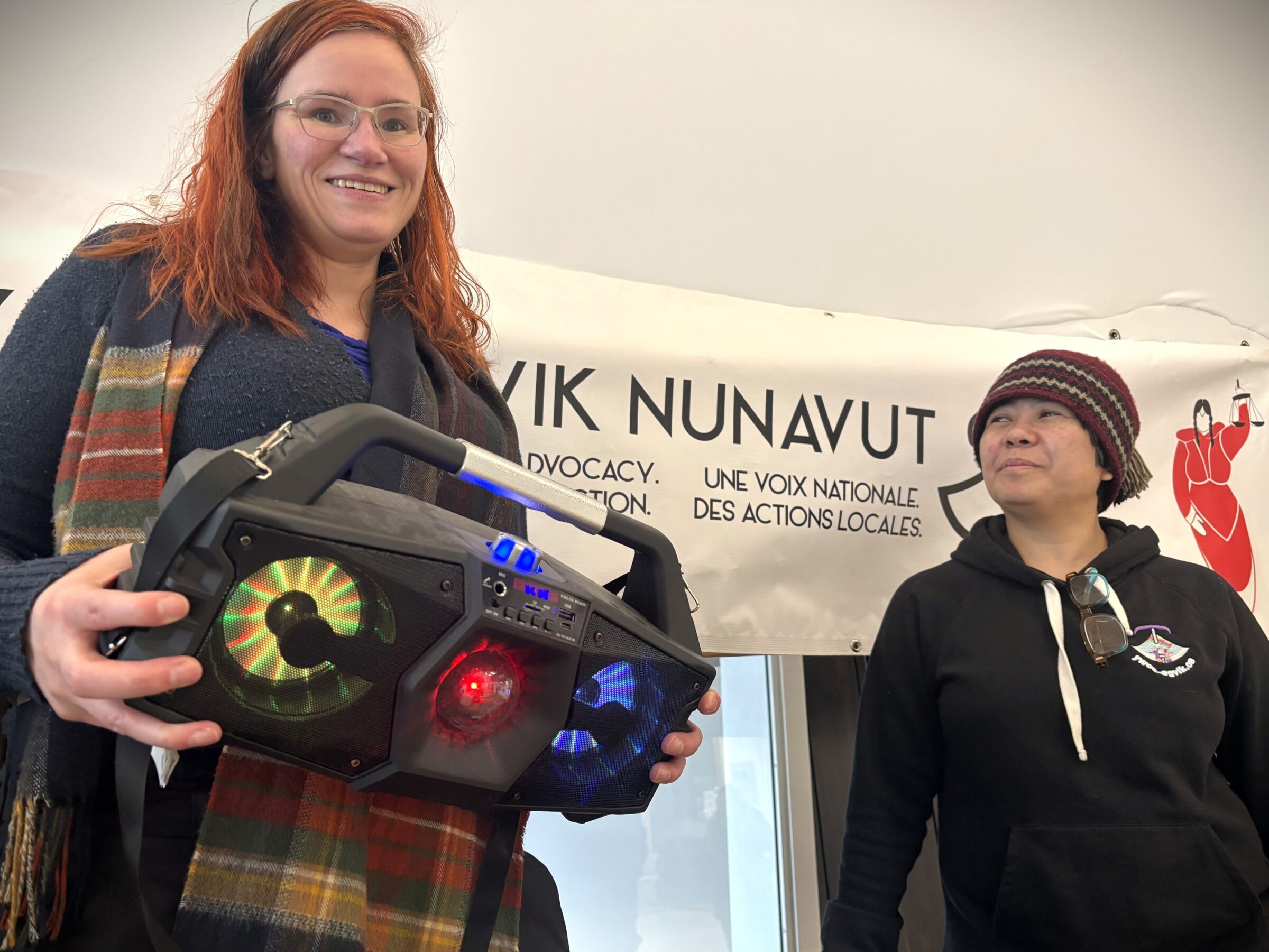YWCA Agvik Nunavut staff Alice Hebb, left, and Pearl Flores blast female hip-hop during an event the organization hosted Sunday to mark International Women’s Day. More than 60 women and their children enjoyed games and free yoga, massages, and hair-braiding, as well as free photo shoots by professional photographers from Full Art Media. The event was supported by the Qulliit Nunavut Status of Women Council and the Government of Nunavut. (Photo by Daron Letts)