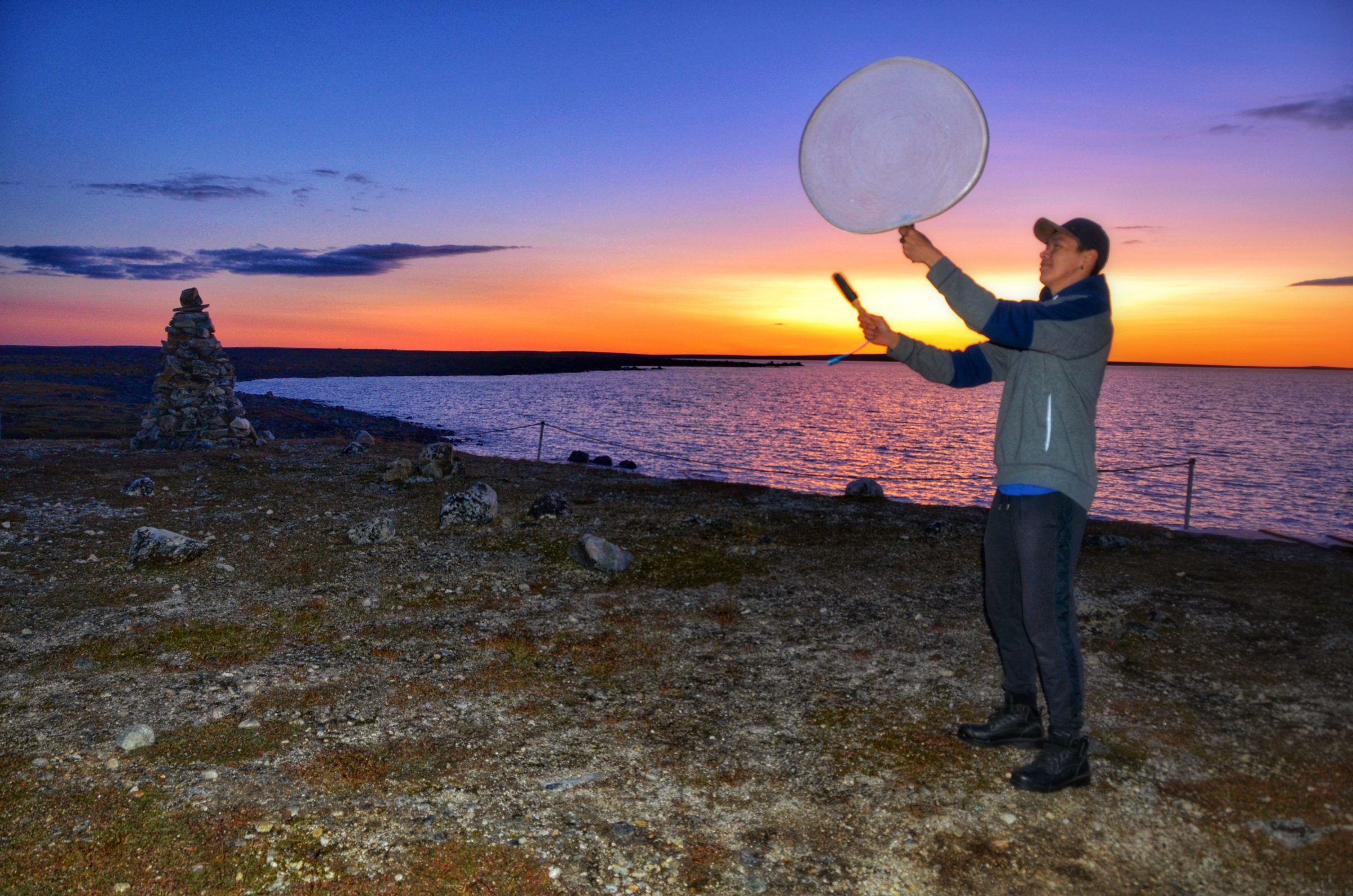 Makusi Alaku of Kangiqsujuaq drum dances outside the Pingualuit park base camp at Manarsulik Lake in Nunavik at sunset on Saturday, Aug. 17. The offices of Nunatsiaq News will close for Labour Day on Monday, Sept. 2. We wish all our readers a happy and peaceful long weekend. (Photo by Isabelle Dubois)