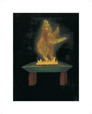 Amitnak says the grizzling bear in her painting is dancing in the flame of a qulliq “to keep all those who see it warm.” (Photo courtesy of Northwestel)